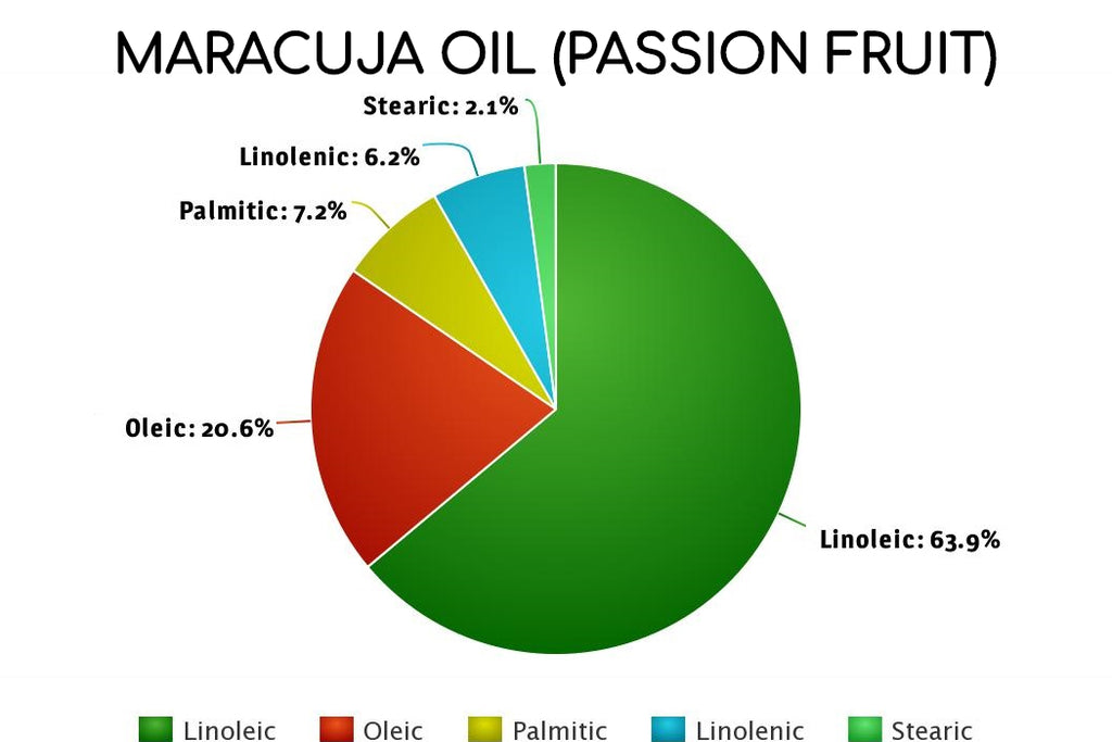 Passion fruit oil is rich in linoleic acid, which is an essential building block for ceramides, one of skin's main moisturizing elements. Our bodies can't make this essential fatty acid, so we need get it from our food or put it on our skin. Also, topical use of linoleic acid helps reduce acne breakouts.