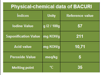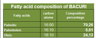 Bacuri butter has a high absorption rate, due to its high level of tripalmitin (50% to 55%), which penetrates the skin quickly. The high amount of fatty palmitoleic acid (5%), compared to other oils (less than or equal to 0.5 to 1.5%), makes the Bacuri butter a fantastic emollient, which can also be used as a moisturizing agent.
